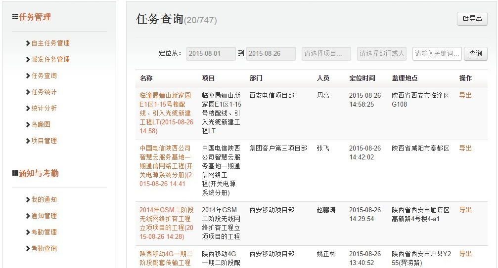 4)为管理者提供web监控窗口,借助地图鸟瞰、任务监控、任务派发、签到等手段,对监理任务实现自上而下,由总体至个体的全方位精细化管理;